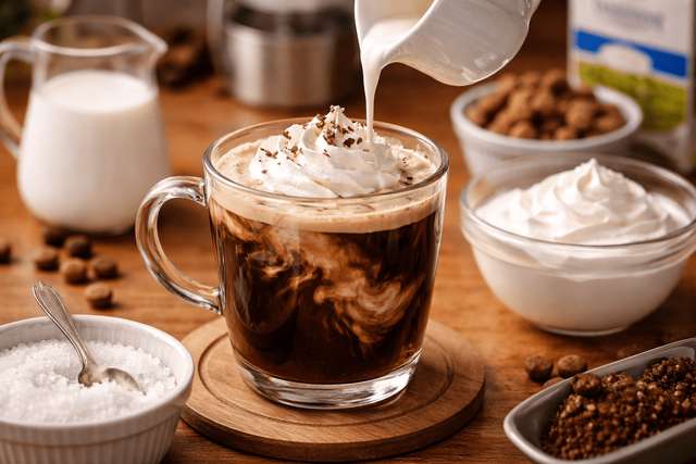 コーヒーに生クリームをそのまま入れた味は、バニラや塩で締めると整いやすいです。甘さとコクに輪郭が出ると、だれにくいでしょう。例は、たとえば塩をひとつまみだけ足す形です。締まると最後まで、飲みやすいですね。